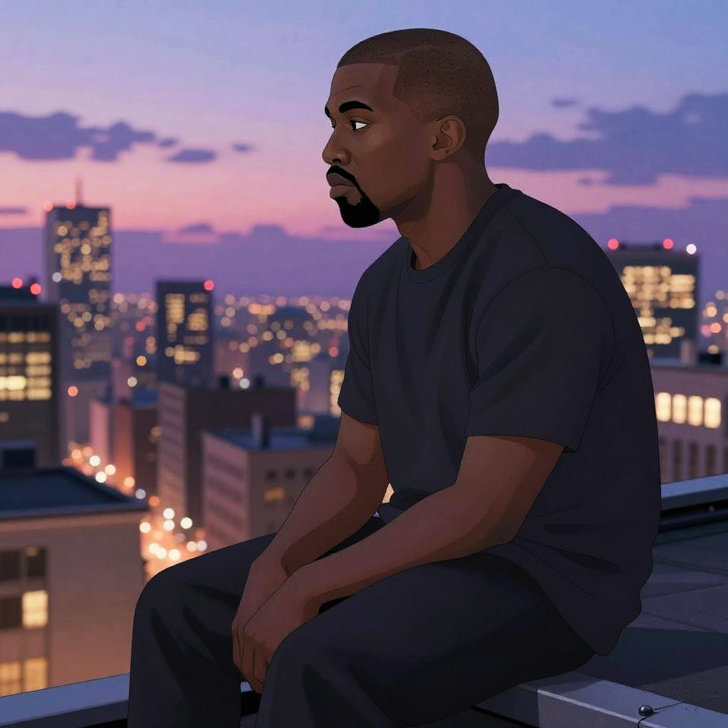 Kanye anime character sitting on rooftop at dusk, overlooking a sprawling city illuminated by purple and pink hues, contemplative mood with soft lighting and detailed character design, smooth anime art style with focus on facial expressions
