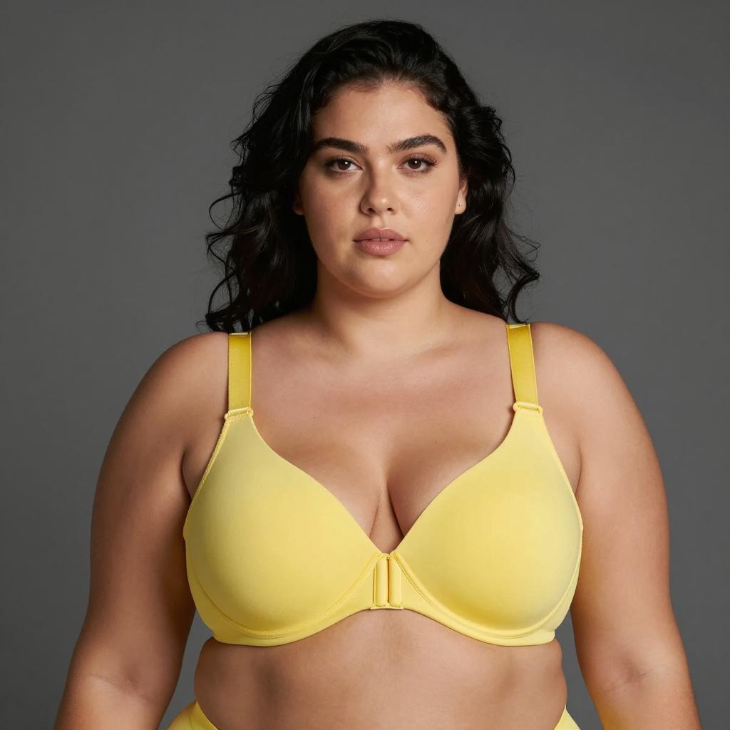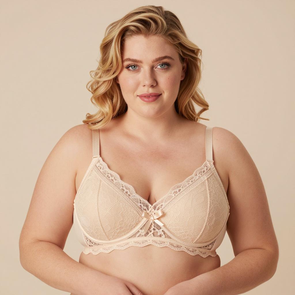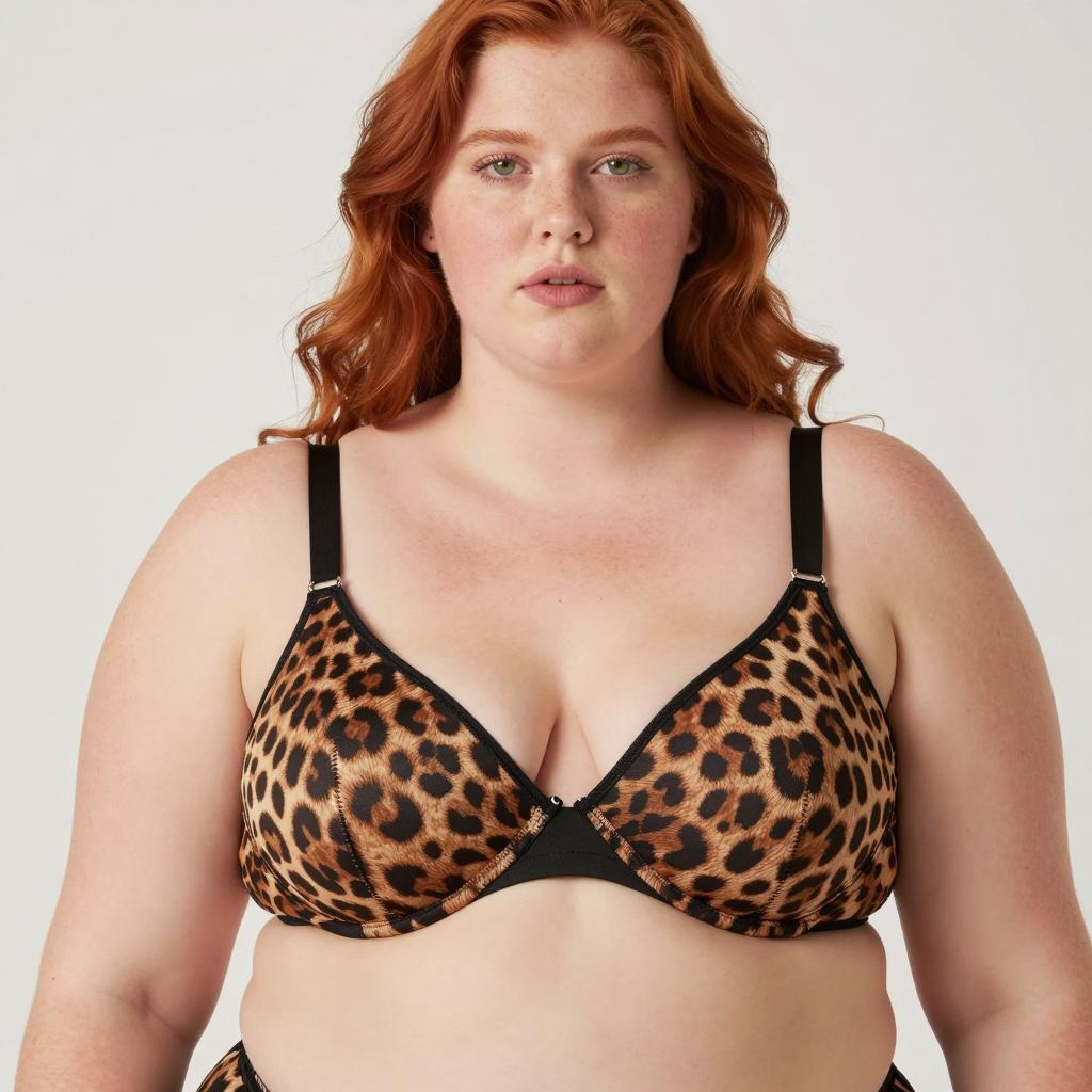Plus-sized woman with long, wavy red hair, wearing a leopard-print bra with deep V-neck, exposing large breasts. White background. Neutral facial expression. Photograph. Upper body shot. Bra has black trim on straps.