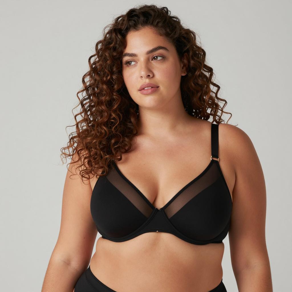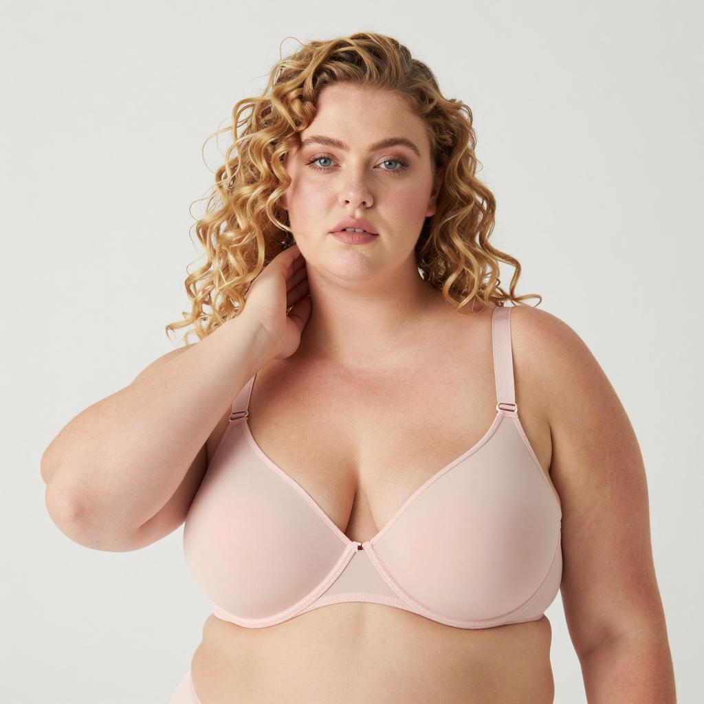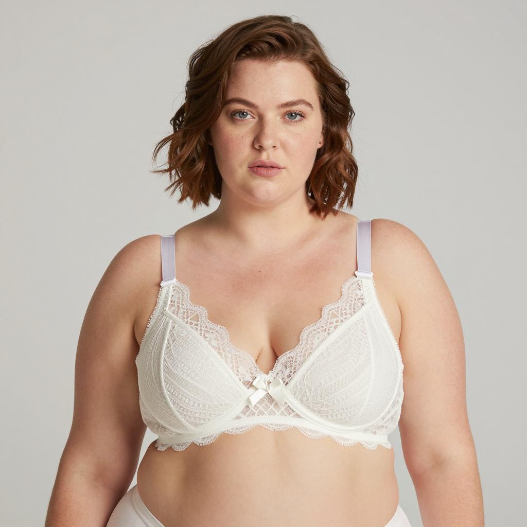 Plus-sized woman with long, wavy red hair, wearing a leopard-print bra with deep V-neck, exposing large breasts. White background. Neutral facial expression. Photograph. Upper body shot. Bra has black trim on straps.