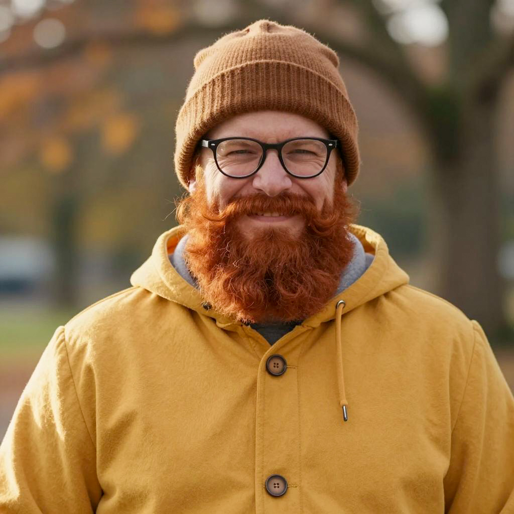 Close-up photograph of a man with curly red hair, thick red beard, wearing black glasses and a green cap. Dark background with blurred edge on the left. Man's eyes look to the right with a neutral expression.