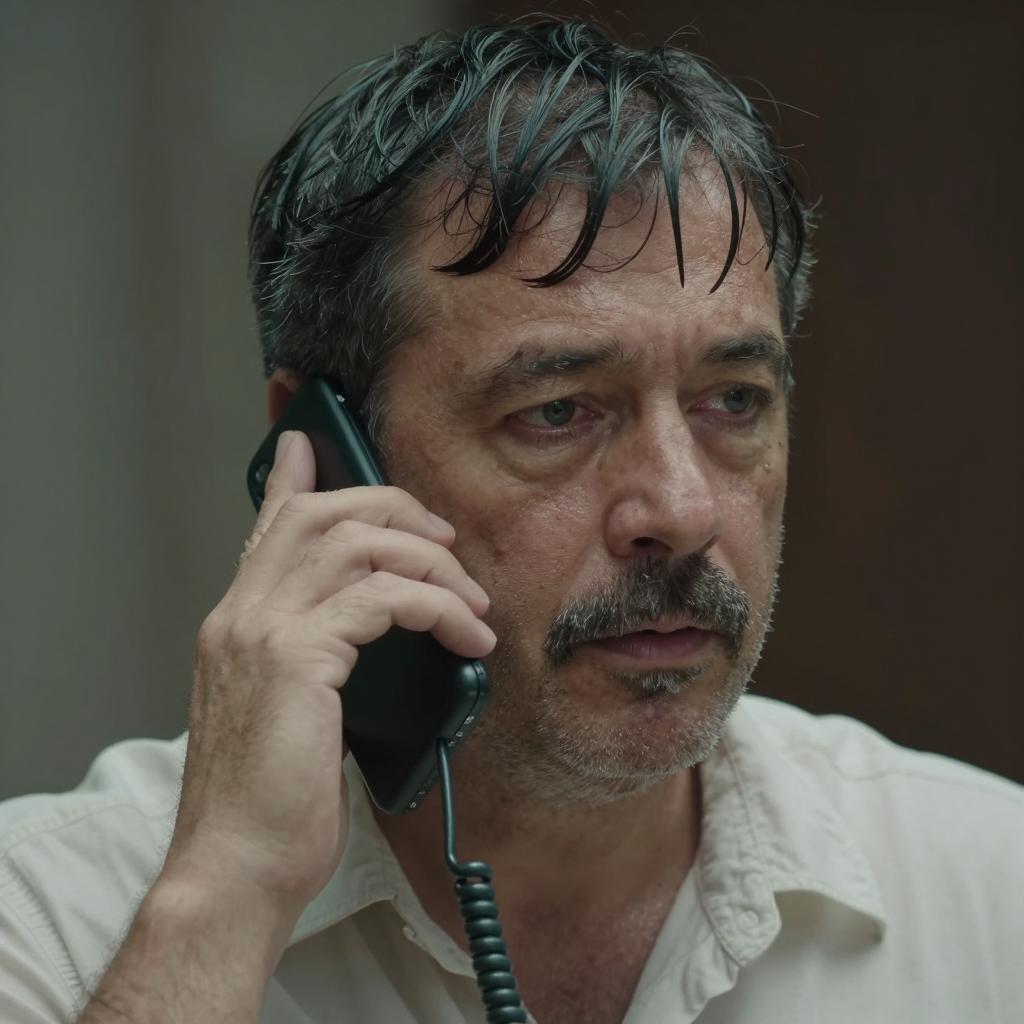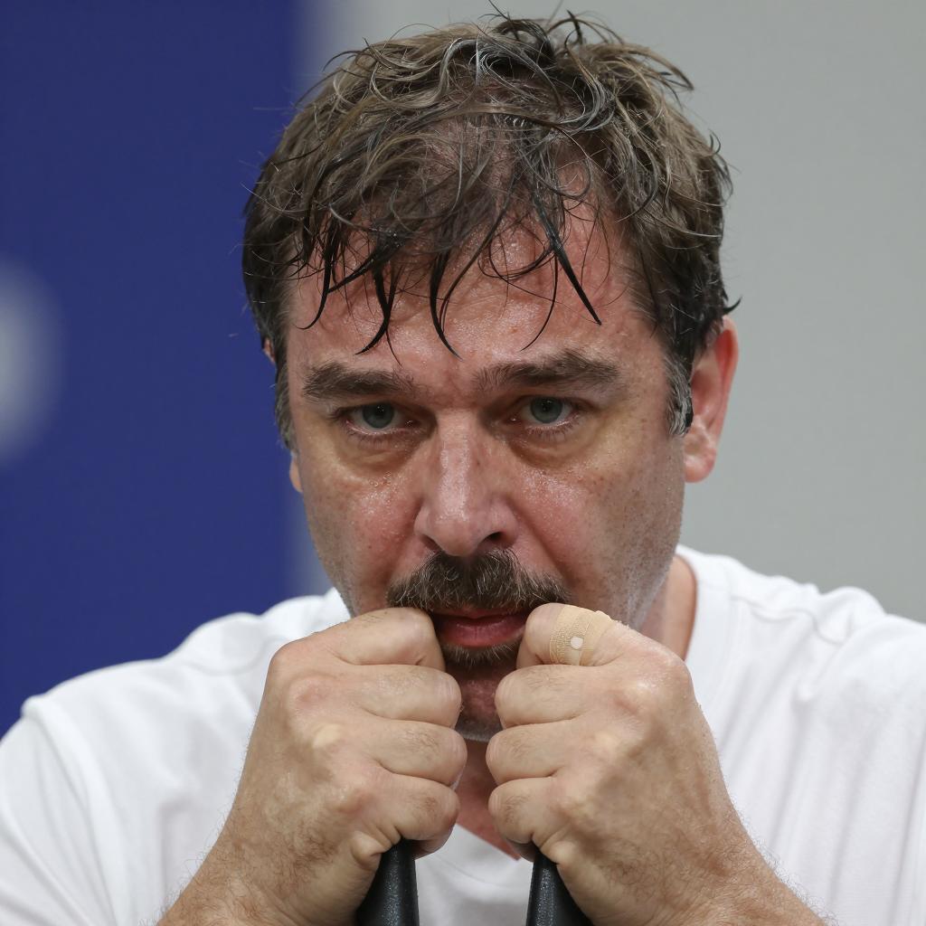 Close-up photograph of a middle-aged man with wet, disheveled brown hair and a mustache, gripping a dark object with both hands near his mouth. He has sweat on his face and wears a white shirt. The background is blurred blue and grey. His intense expression is focused. One hand has a bandage on the knuckle.