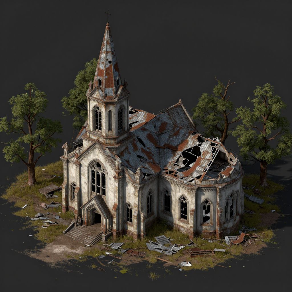 The image depicts an abandoned church in a state of ruin, reminiscent of the post-apocalyptic world seen in the TV series \"The Walking Dead.\" The church, rendered in a hyper-realistic, isometric style, stands on a small, overgrown patch of land. Its once-grand structure is now trampled and damaged, with peeling paint and rusted metal. The roof is partially collapsed, and the windows are broken, allowing light to filter through the decay. Surrounding the church are tall, withered trees and patches of grass, adding to the desolate atmosphere. The overall composition is detailed and textured, with a focus on the intricate interplay of light and shadow, creating a sense of depth and realism. The scene is devoid of any human presence, emphasizing the passage of time and the enduring impact of the apocalypse on the environment.