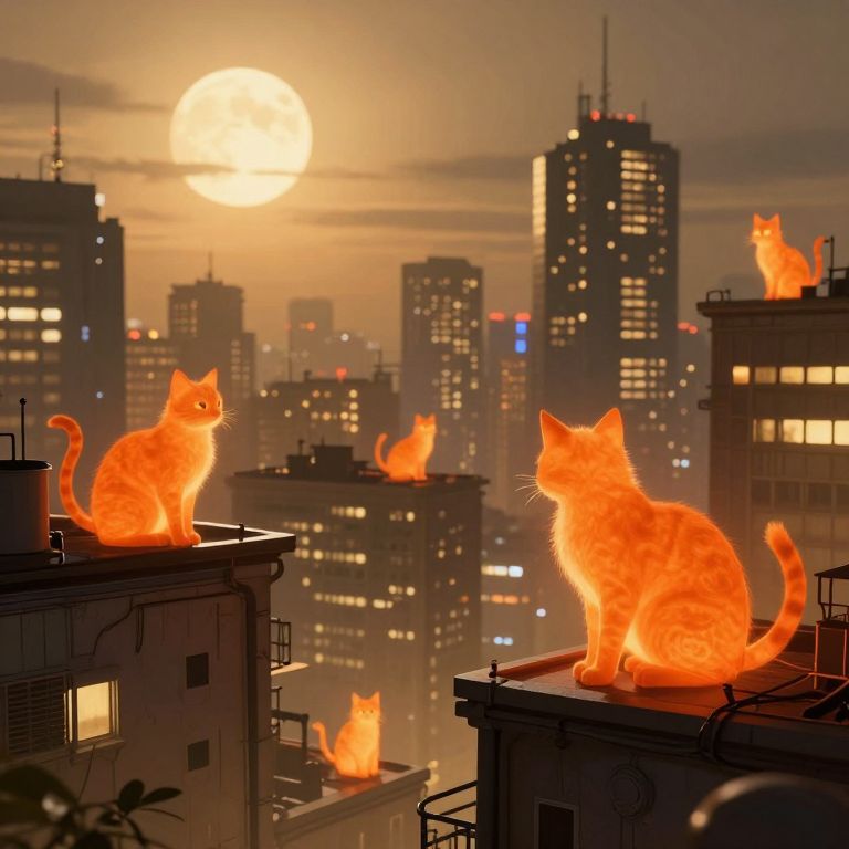 In a cyberpunk-inspired digital art rendering, a surreal cityscape at night features rooftops adorned with luminous orange cats, their ethereal glow contrasting against the golden hour ambiance of the moonlit urban landscape.