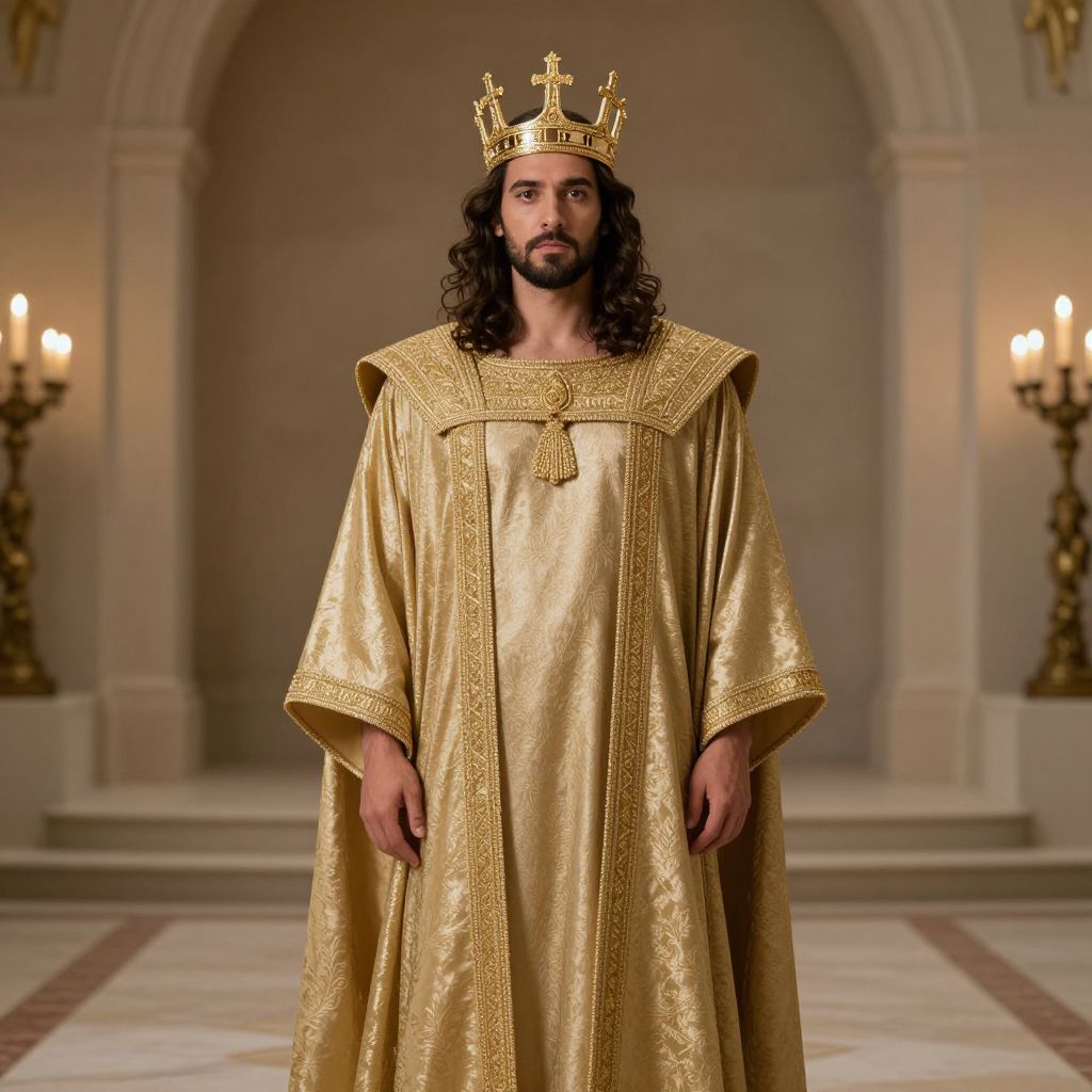 Photograph of a dark-haired, bearded man with a medium build wearing a golden, ornately embroidered robe and a gold crown with a cross. He stands centered in a grand, dimly lit room with arched walls and two lit candelabras on either side. The robe has a high collar and long sleeves, and the background features a marble floor with red and white tiles. The man's expression is solemn, and the lighting highlights the rich texture of the golden fabric. The overall scene exudes a regal and majestic atmosphere.