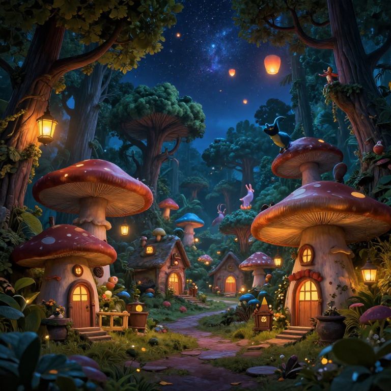 Whimsical, night-time forest scene with glowing mushroom houses, lanterns, starry sky, and fairy lights. Digital art style, vibrant colors