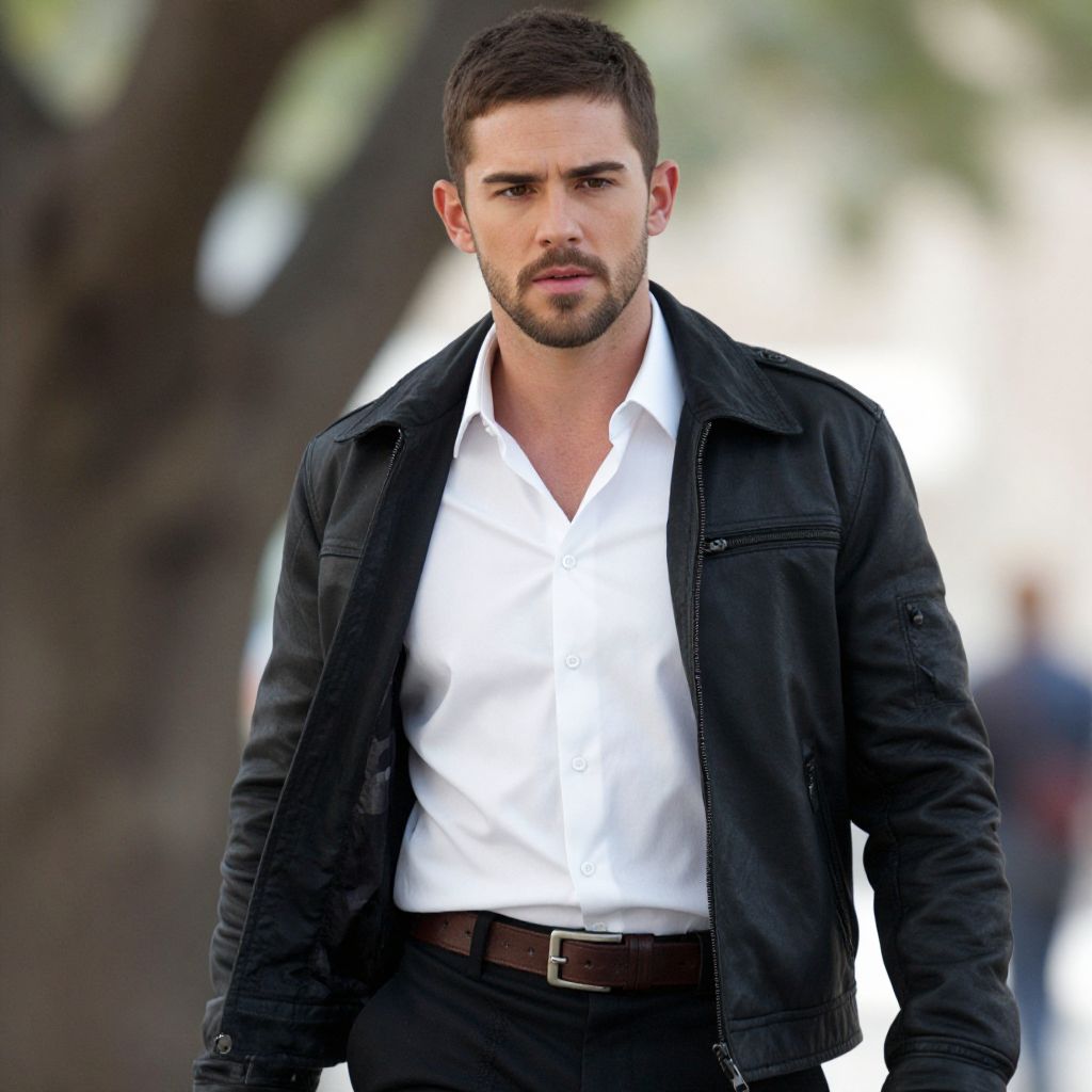 Photograph of a handsome, fit man with short, dark brown hair and a trimmed beard. He has a serious expression and is wearing a black leather jacket over a white, slightly unbuttoned dress shirt, with black pants and a brown belt. The background is blurred, featuring dark tree trunks and patches of light, suggesting an outdoor setting. The image focuses on the man from the waist up, highlighting his clean, stylish appearance. The lighting is natural, enhancing his strong jawline and well-groomed look.