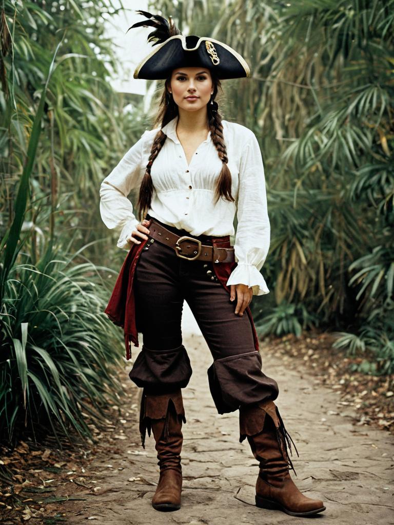 Realistic pirate costume, solo, hat, 1girl, boots, pirate hat, brown hair, standing, pants, full body, long hair, belt, long sleeves, braid, pirate, brown footwear, shirt, white shirt, hat feather