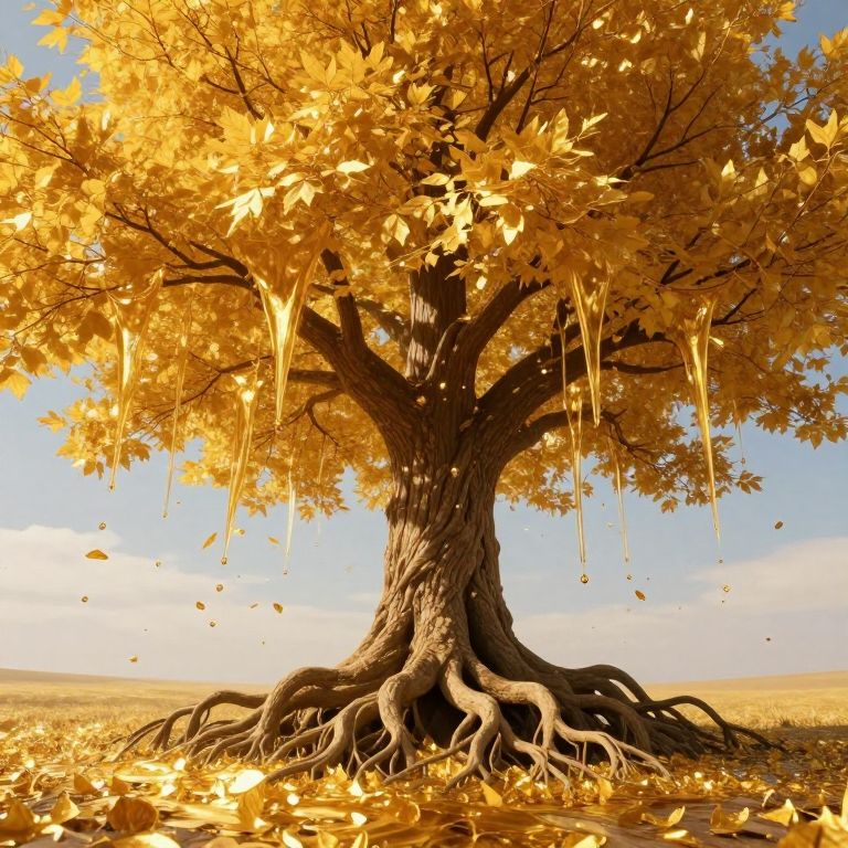 Golden leaves cascade from a majestic tree with sprawling roots suspended above ground, transforming into liquid gold as they drift downward, creating a mesmerizing blend of nature and magic against a serene sky.