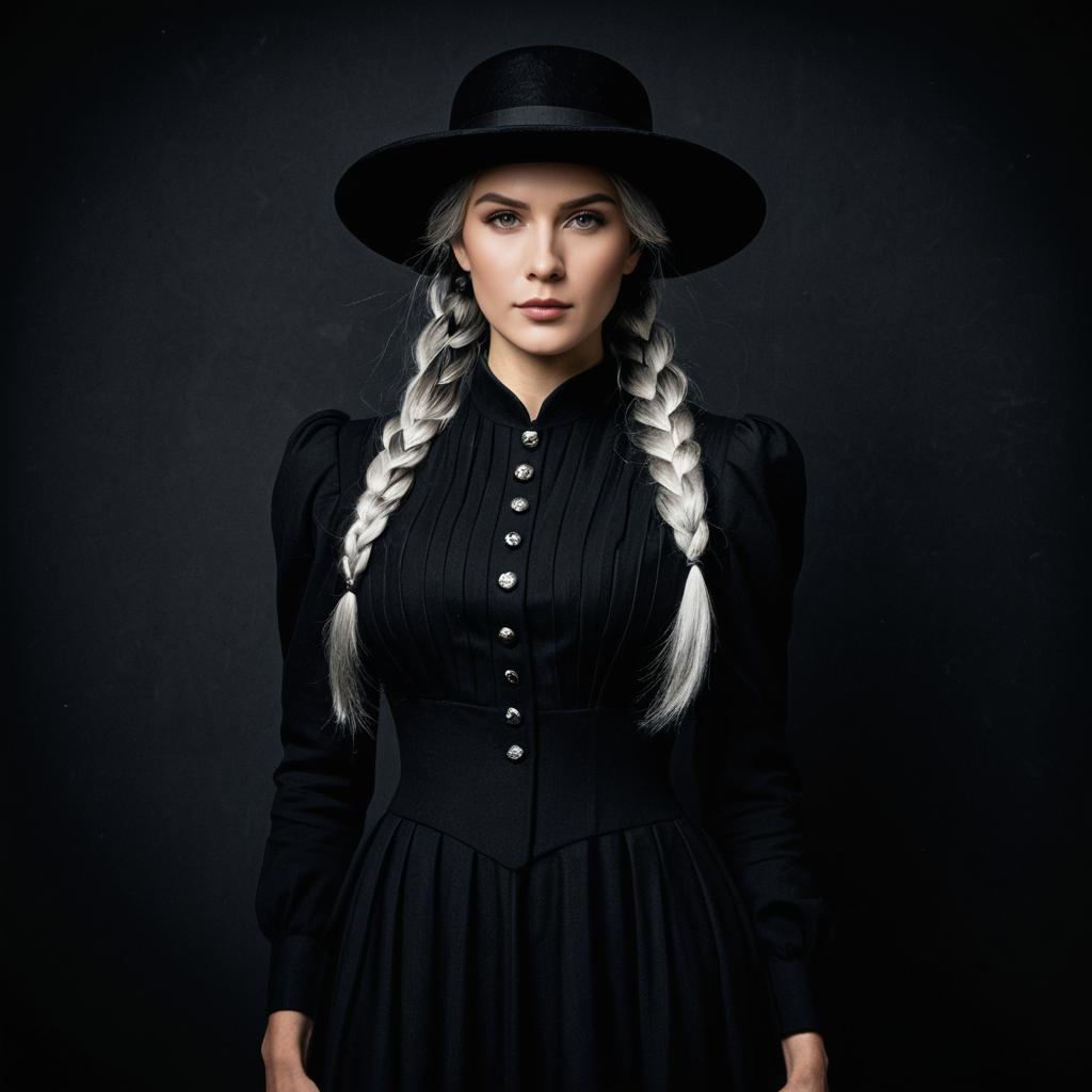 Portrait of a young woman with braided silver hair wearing a vintage black dress and wide-brimmed black hat. She stands against a matte black background, creating a seamless and intense monochrome effect. Her soft amber eyes contrast vividly with the dark tones, highlighting her facial features with dramatic lighting. The dress features detailed buttons and structured shoulders, emphasizing a timeless, elegant style.