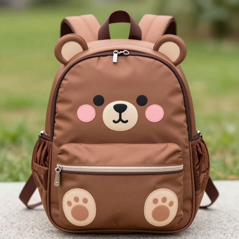 Brown bear-themed kids' backpack featuring waterproof neoprene material, designed with adorable cartoon ears, rosy cheeks, and a friendly face, perfect for kindergarten use.