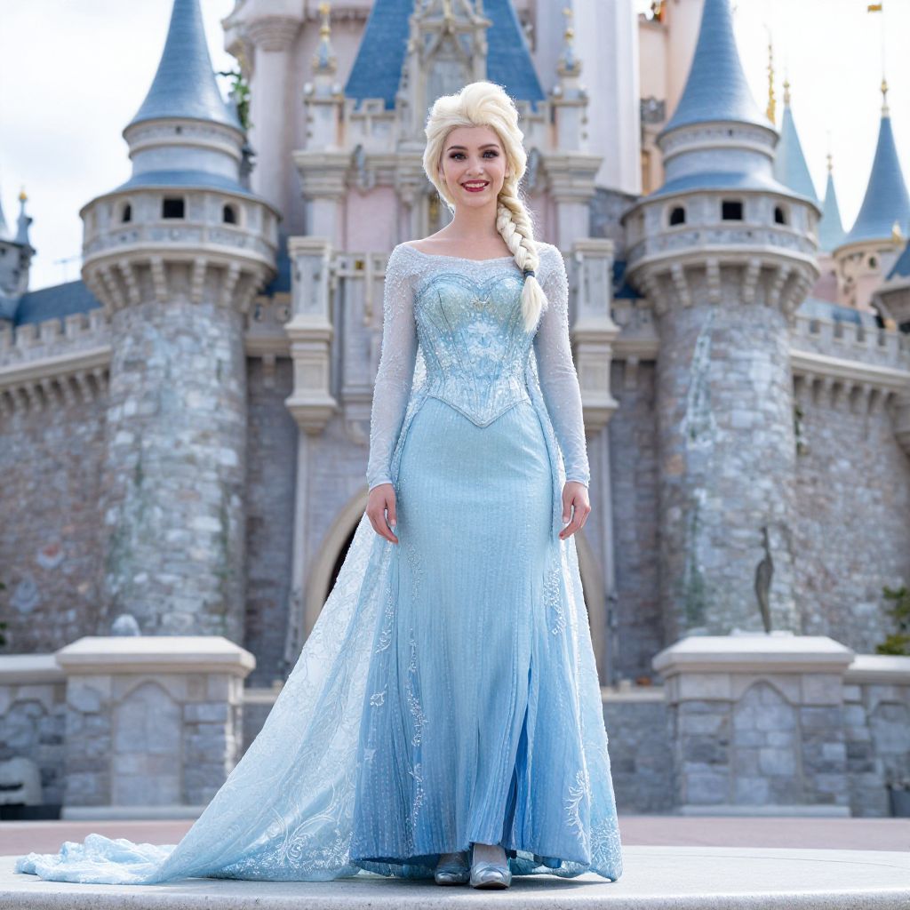 Queen Elsa Coronation Dress, a woman in a blue dress standing in front of a castle