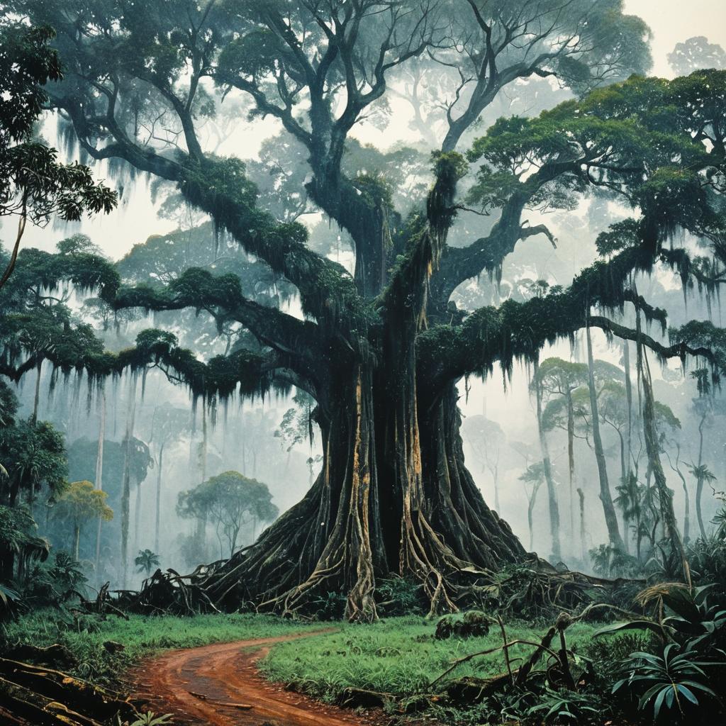 Watercolor painting of ancient banyan tree in Misty Southeast Asian rainforests, art by Joseph Mallord William Turner, Claude Monet, cinematic lighting and lush detail.