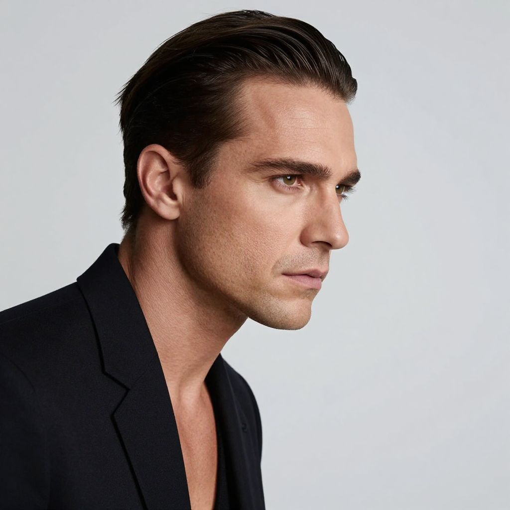 Photograph of a handsome, attractive man with slicked-back, dark brown hair and light skin. He's wearing a black blazer over a black shirt, looking intently to the right with a serious expression. The background is a plain, light gray, making him stand out. His features are sharp, and his jawline is well-defined. The lighting is soft, highlighting his facial contours.
