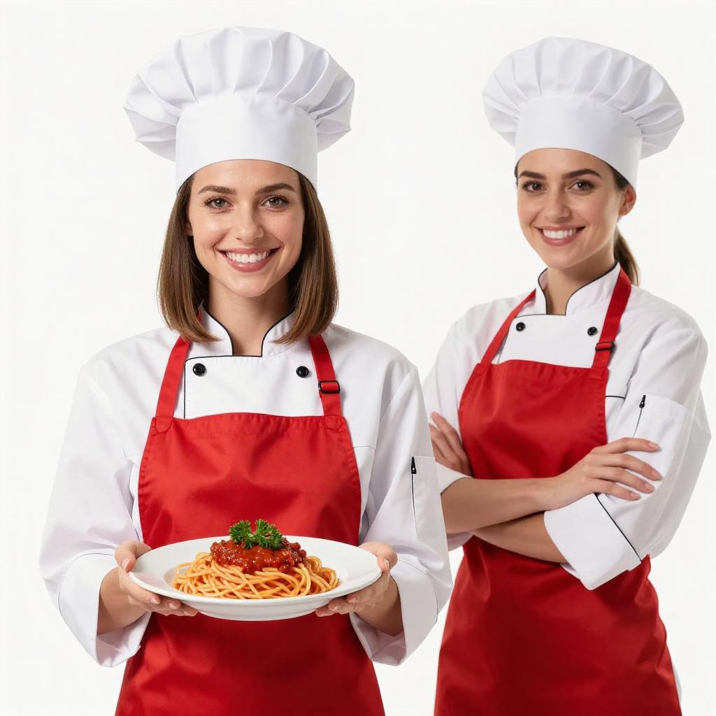 Photograph of two smiling female chefs with straight brown hair, wearing white chef hats and red aprons over white shirts. The chef in the foreground holds a plate of spaghetti with red sauce and garnished with parsley, while the chef in the background stands with her arms crossed. The background is plain white, making the chefs and their red aprons stand out prominently.