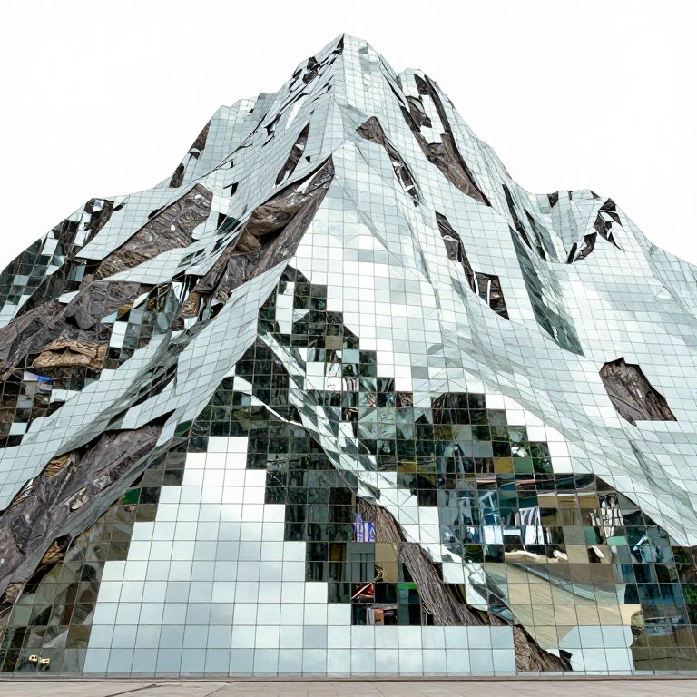 This is a digital photograph of a modern architectural facade featuring a mountain-like structure composed of reflective, square tiles. The tiles create a mosaic effect, mirroring a rugged, snow-capped mountain with dark brown rocky outcrops and white snow. The background is a bright, overexposed white, emphasizing the reflective quality of the tiles. The lower portion of the image shows a red-paved ground, contrasting with the white and brown mountain reflections. The overall style is contemporary and abstract, blending natural and architectural elements through digital manipulation.