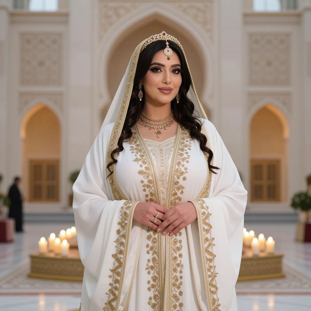 A woman of Arab heritage dressed in a luxurious wedding costume featuring a flowing white abaya with gold embroidery and a detailed headpiece, standing in a grand, ornate mosque courtyard during a traditional celebration, her face gentle and proud, with a soft glow of candlelight around her.. The woman has big tits and cute face