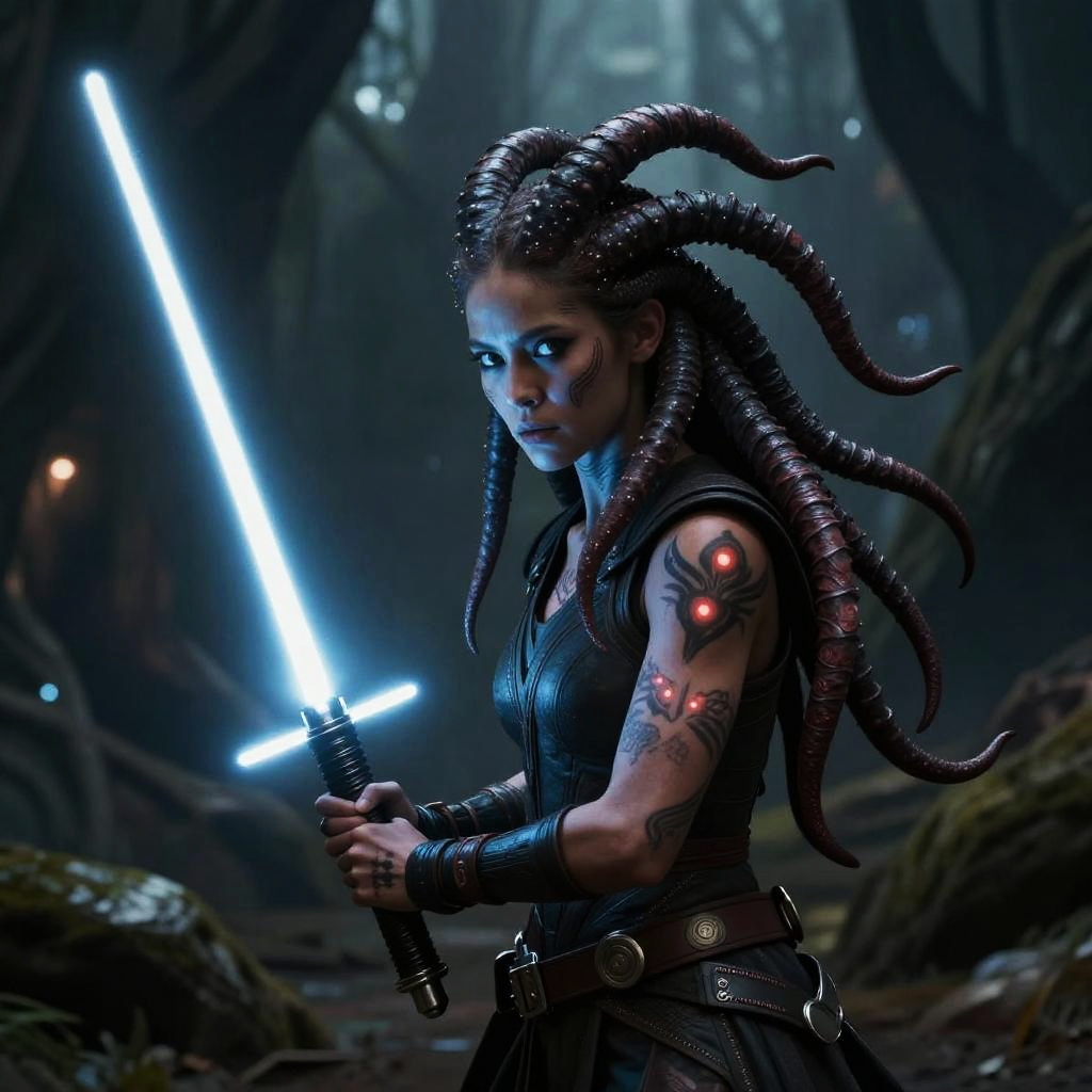 Star Wars alien girl with tentacle-like hair and mysterious glowing tattoos, wielding a lightsaber in a dark forest on an alien planet, dramatic shadows and epic atmosphere, fantasy style
