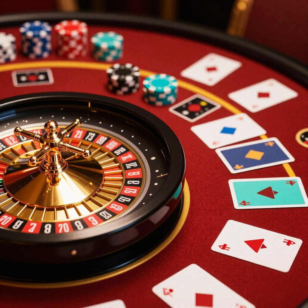 Casino color palette showcasing intense reds, shimmering golds, cool turquoises, and glossy blacks highlighting the thrill of roulette wheels and card games, rendered in a futuristic style with sharp contrasts and reflective surfaces.