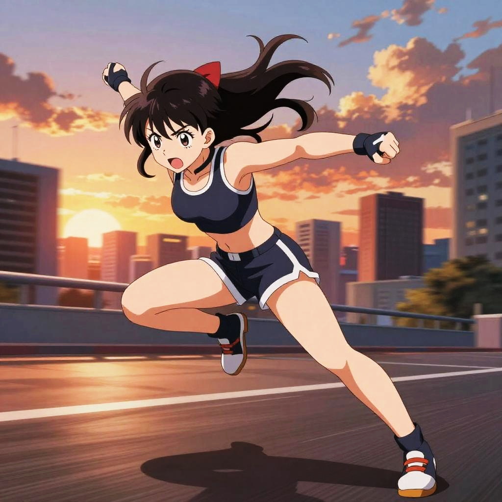 Anime-style drawing of a determined young woman with black hair and red bow, running in athletic gear on a sunset-lit city bridge.