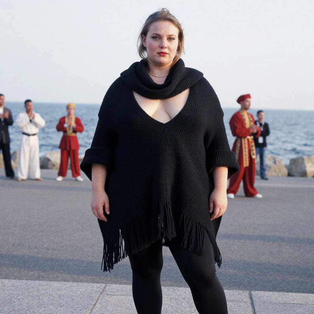 A Plus-size woman in a bohemian oversized black knit poncho with a cowl neck and fringe detailing, fitted black leggings, captured in the visual style of anscochrome analog film, standing on a seafront promenade with street performers. Sexy. Pretty face and beаutiful eyes. Big breasts