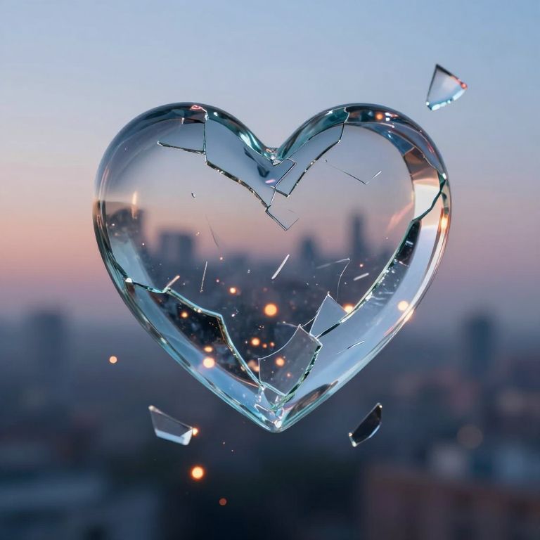 Heartach depicted as a shattered glass heart suspended in midair, each fragment reflecting memories of lost love against a blurred, melancholic cityscape backdrop at twilight, with soft glowing embers symbolizing lingering hope.