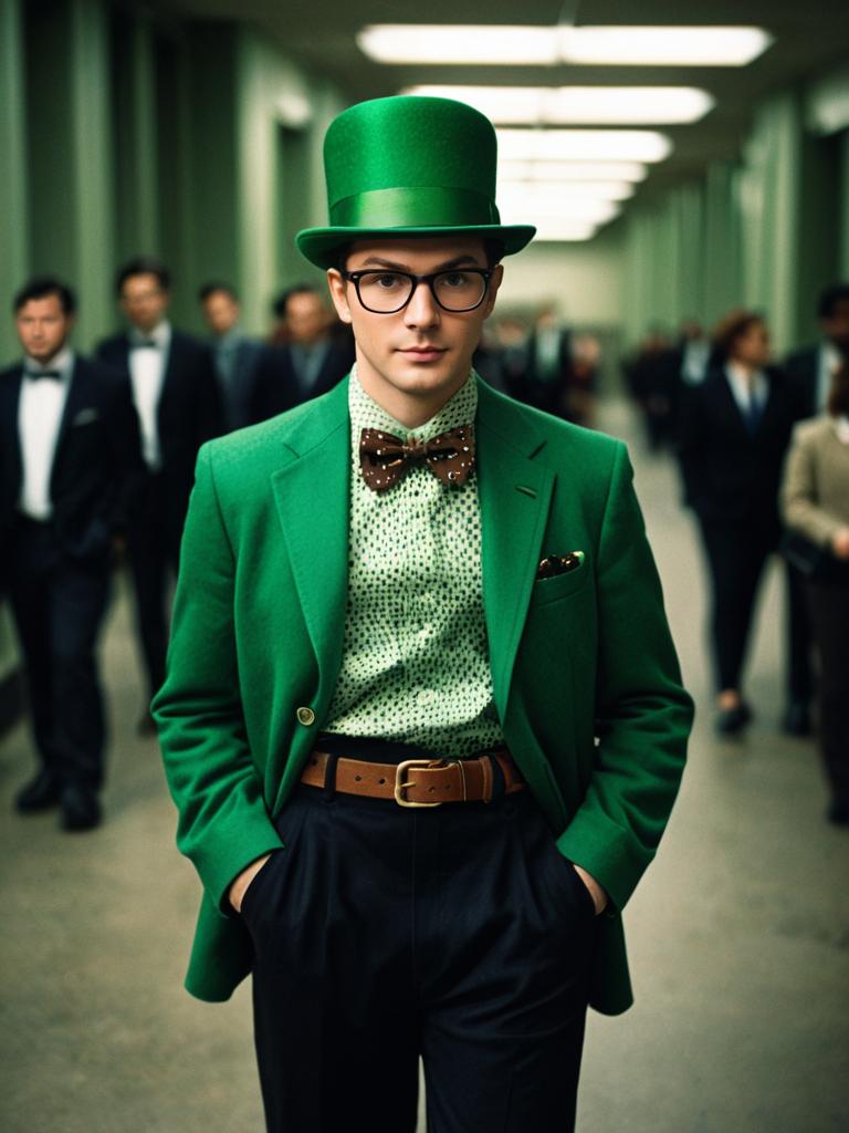Frank gorshin riddler suit, 1boy, male focus, solo, hands in pockets, blurry background, glasses, hat, jacket, green headwear, formal, belt, suit, pants, black pants, blurry, shirt, brown hair, looking at viewer, bowtie