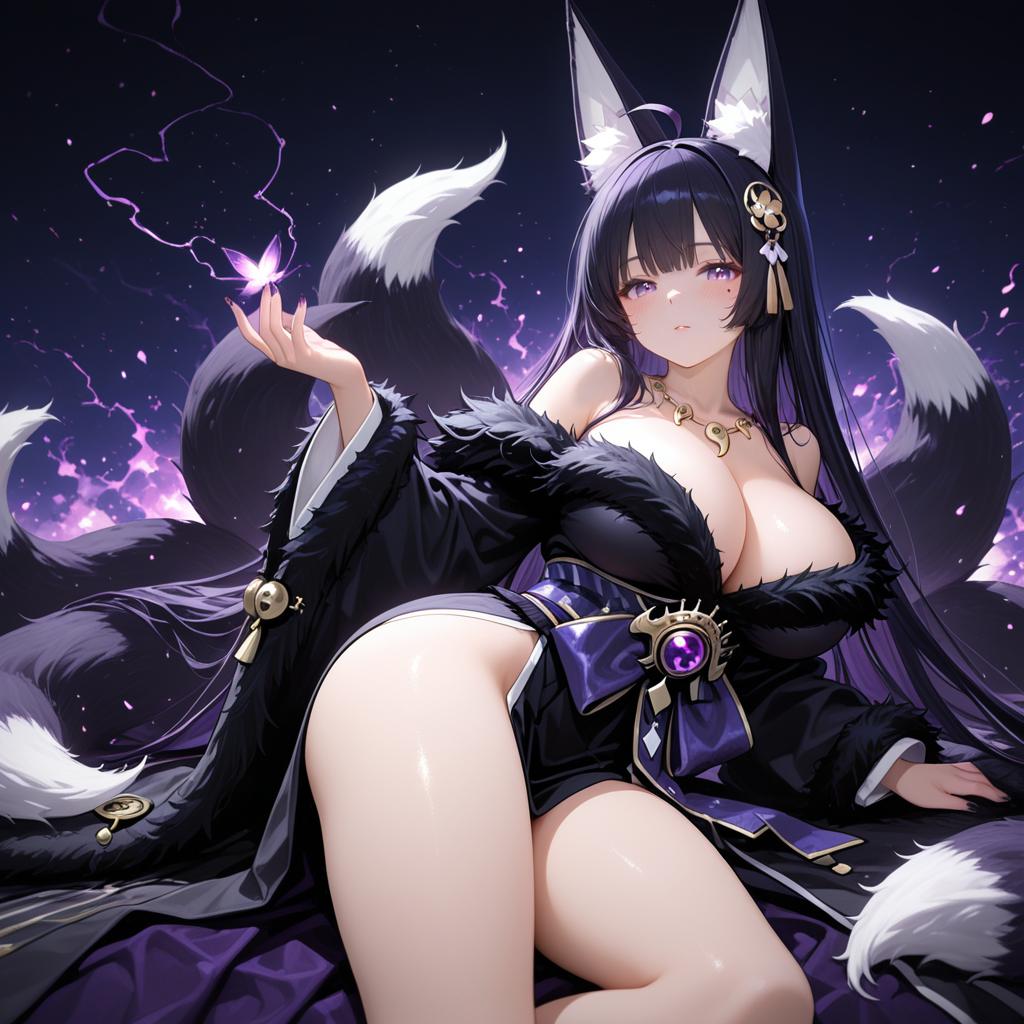This is a digital anime-style illustration of a beautiful, dark-haired, fox-eared woman with large white-tipped black fox tails. She has pale skin, large purple eyes, and is wearing a black, fur-trimmed, off-shoulder dress that reveals her ample cleavage and thighs. She has a gold necklace and a hair accessory with a gem. She holds a glowing purple butterfly in her right hand, with more butterflies and sparks of light surrounding her. The background is a dark, starry night sky. The overall composition emphasizes her seductive and mystical aura.