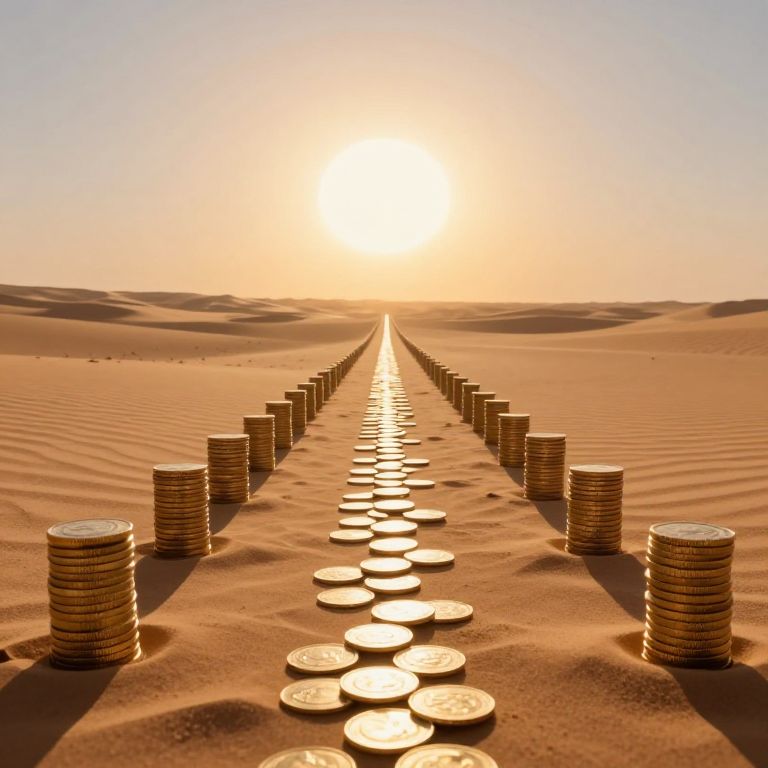 Photograph of a sunlit desert landscape with a straight, narrow path of gold coins leading to the horizon. The coins are neatly arranged in two parallel rows on either side, with stacks of coins at each end. The golden coins glisten under the bright, setting sun, casting elongated shadows on the rippled sand dunes. The sky is clear with a gradient from orange near the sun to blue at the top. The overall scene evokes a sense of endless wealth and journey towards a distant, shimmering goal.
