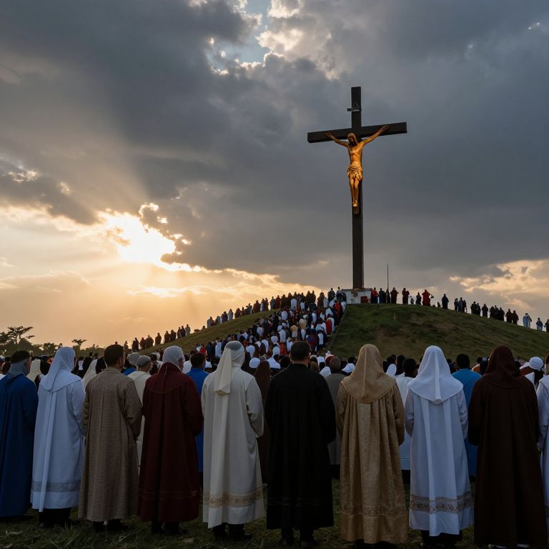 Photograph of a large crowd in religious robes standing before a tall crucifix on a hill, under a dramatic, cloudy sunset sky.