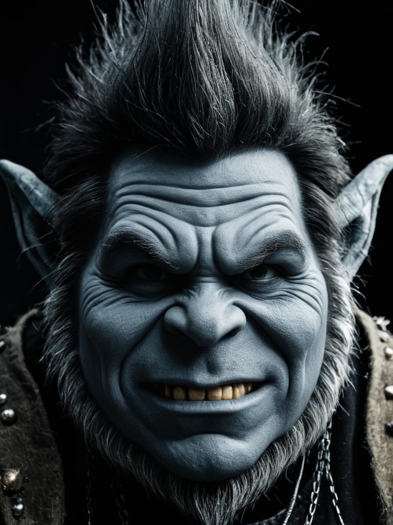 Man in Troll Costume, close-up detailed headshot, photorealistic realism