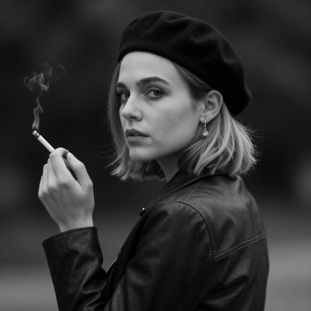 Black-and-white photograph of a woman with short, light-colored hair, wearing a black beret and leather jacket, looking over her shoulder while holding a lit cigarette. Her expression is serious, and she has dangling earrings. The background is dark and blurred, emphasizing her face and upper body.