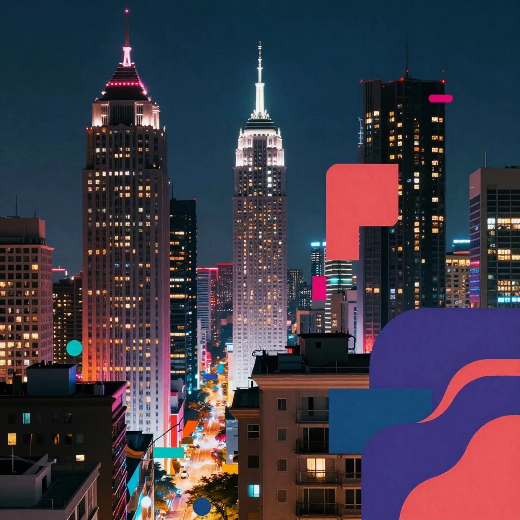 Nighttime cityscape photograph of a brightly lit skyscraper-filled skyline, featuring colorful neon lights, illuminated windows, and abstract digital overlays in blue and pink