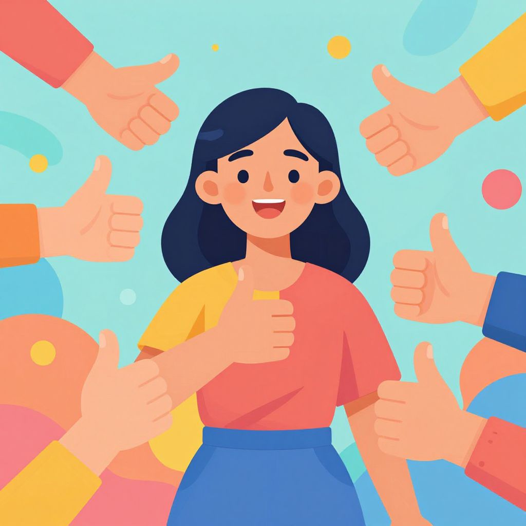 A vibrant vector illustration depicts a smiling young woman at the center, surrounded by multiple hands giving thumbs-up gestures, symbolizing public approval, acknowledgment, and acceptance in a colorful and dynamic composition.