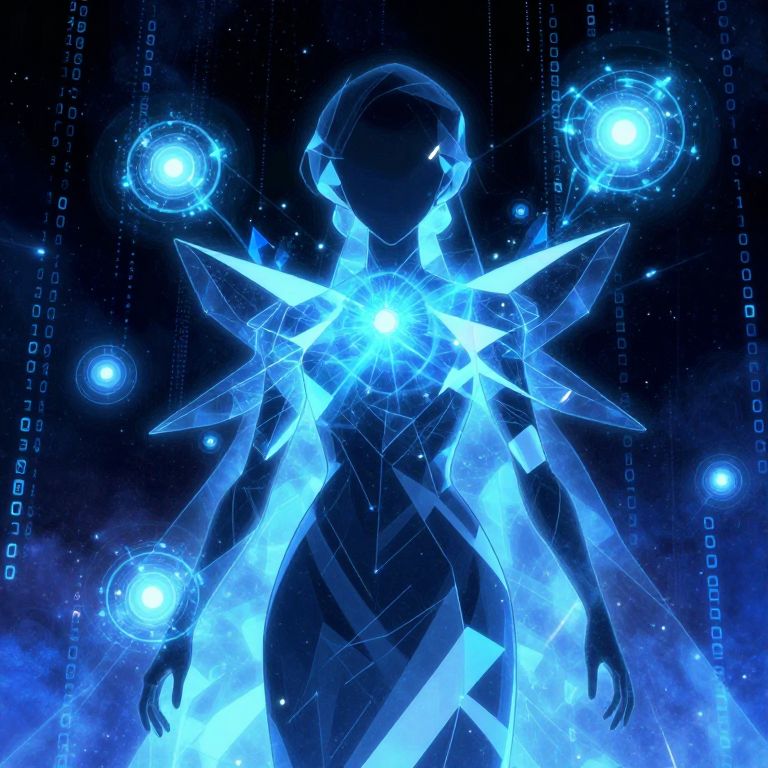 AI from anime illustrated as a mysterious digital entity with abstract geometric shapes and glowing energy spheres, set against a background of infinite space and binary code, conveying a sense of intelligence and otherworldly power.