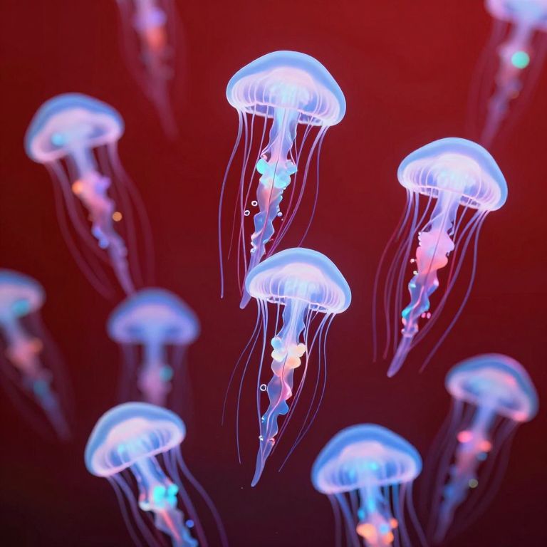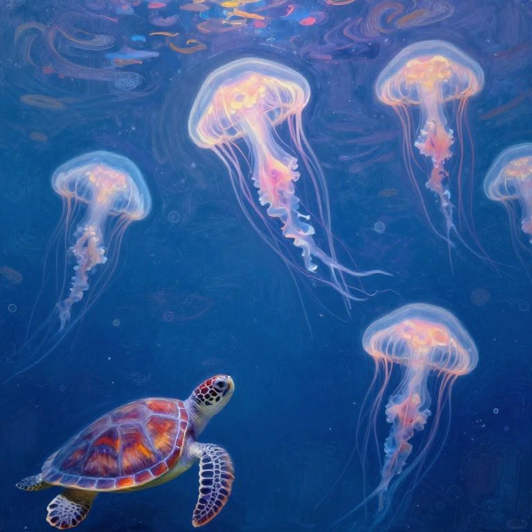 Imagine an enchanting underwater ballet performed by a group of translucent jellyfish gracefully suspended in mid-air as if defying gravity. This scene is captured through the artistic approach of impressionism, with swirling brushstrokes representing the delicate movements and ethereal glow of these marine creatures. The perspective offers a 'bug's-eye view' from an intrigued sea turtle observing this mesmerizing display, adding an element of wonder to the already captivating image. As the jellyfish dance, their luminescent tendrils cast vibrant hues across the dreamlike atmosphere, evoking feelings of serenity and awe in equal measure. This imaginative fusion of underwater fantasy with impressionistic technique creates a visually stunning and emotionally resonant experience.