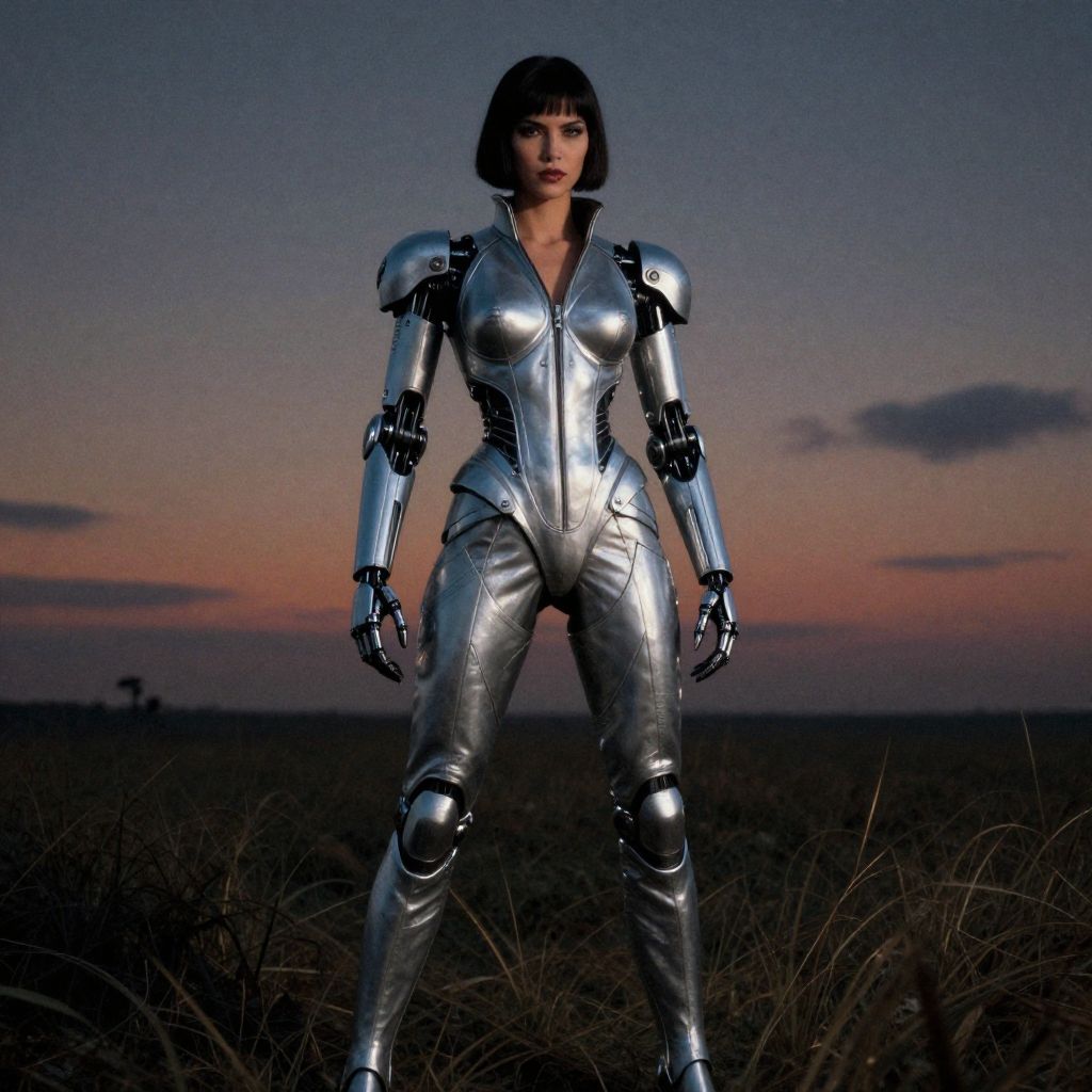 Cinematic film still a painting of a woman in a silver suit standing in a field, cyberpunk art inspired by hajime sorayama, artstation, computer art, mechanized soldier woman, dominatrix assassin robot, mechanized valkyrie woman, 8k resolution best quality, high quality, high detail, 4k, 8k resolution, film grain, rim lighting twilight intrigue, dusky, intriguing, shadowy, noir allure, by helmut newton . shallow depth of field, vignette, highly detailed, high budget, bokeh, cinemascope, moody, epic, gorgeous, grainy