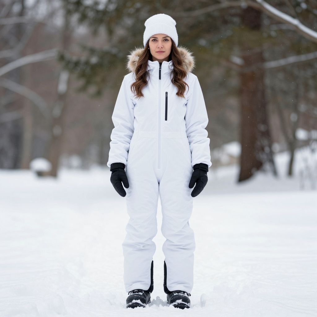 Snowsuit Woman Costume, woman in white jacket and snow pants standing in the snow