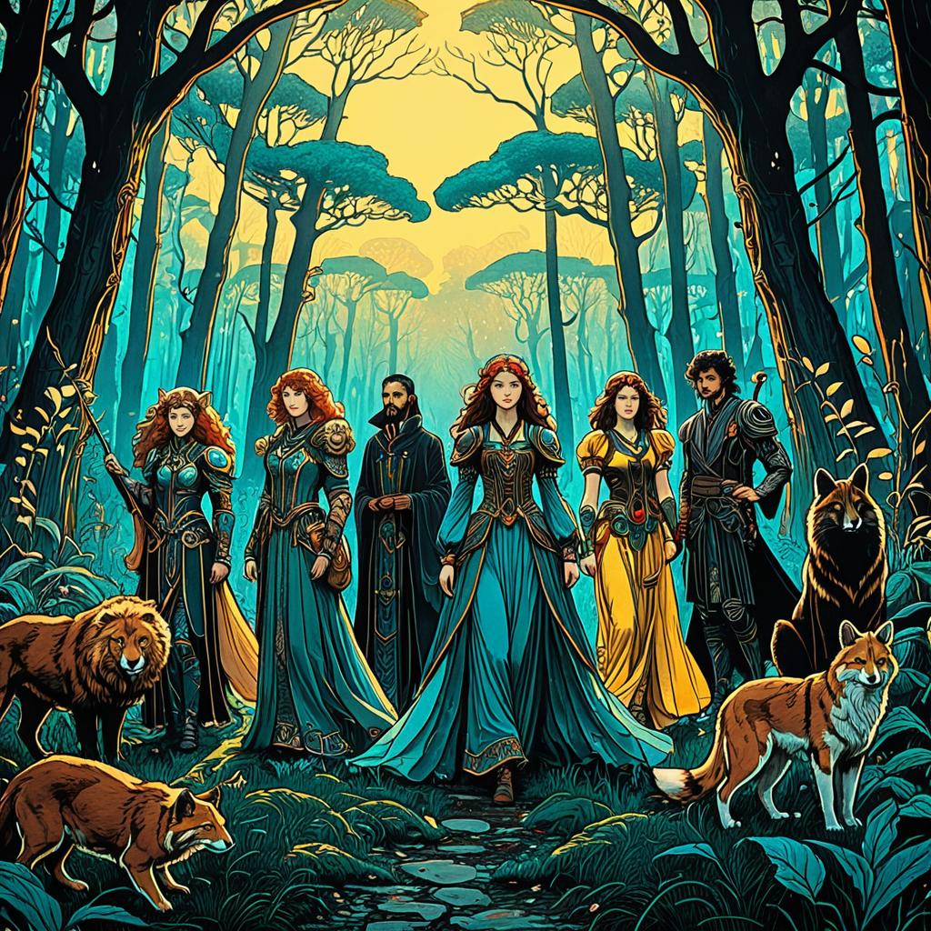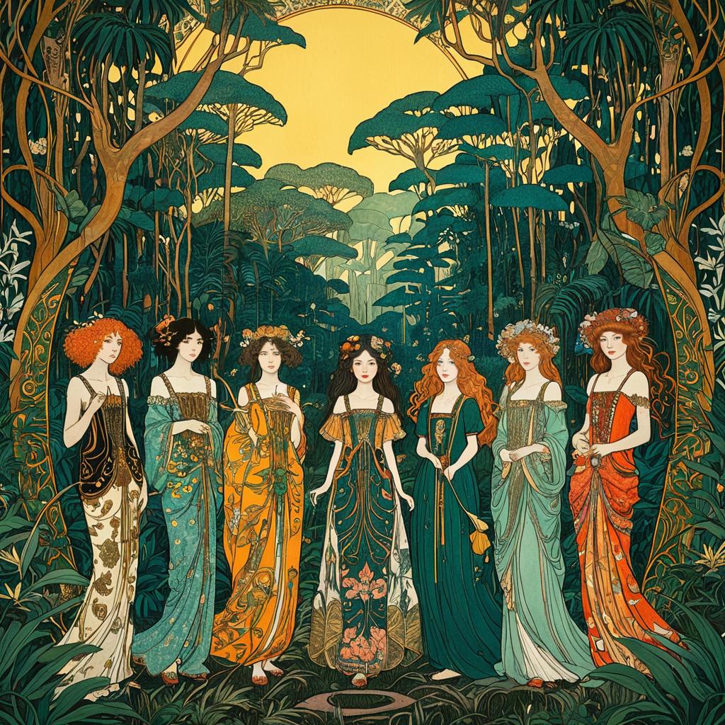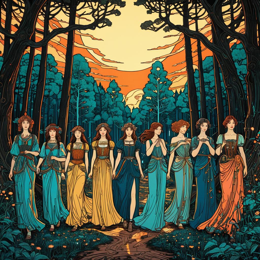 Depict twelve harbingers of the four constellations in ancient moonlit temple ruins at golden hour, merging Art Nouveau fluid lines with cyberpunk neon accents, inspired by Pre-Raphaelite paintings and shoujo manga, with stunningly detailed fine inking lines, flat colors, 4k photorealistic.