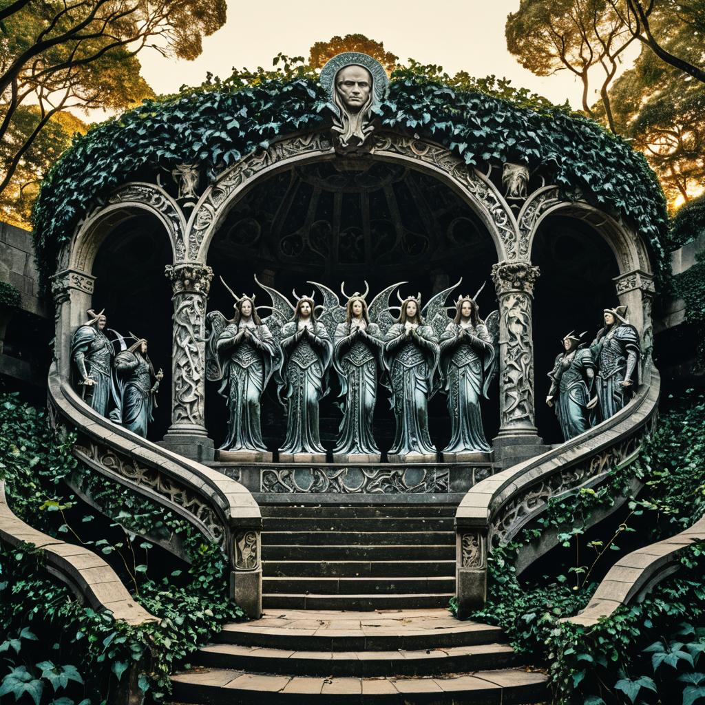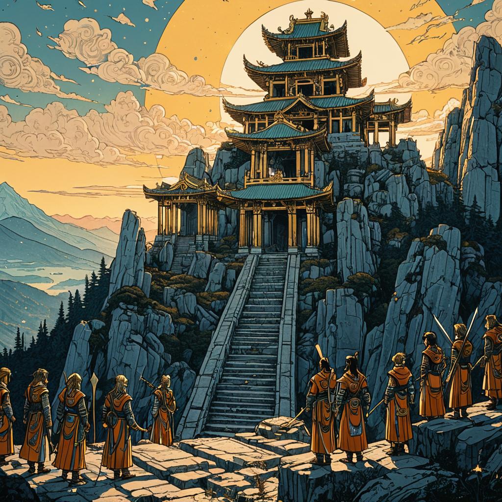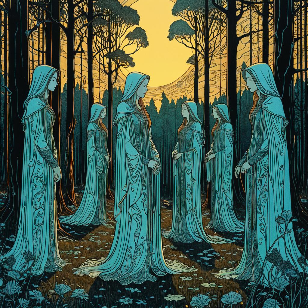 Depict twelve harbingers of the four constellations in ancient moonlit temple ruins at golden hour, merging Art Nouveau fluid lines with cyberpunk neon accents, inspired by Pre-Raphaelite paintings and shoujo manga, with stunningly detailed fine inking lines, flat colors, 4k photorealistic.