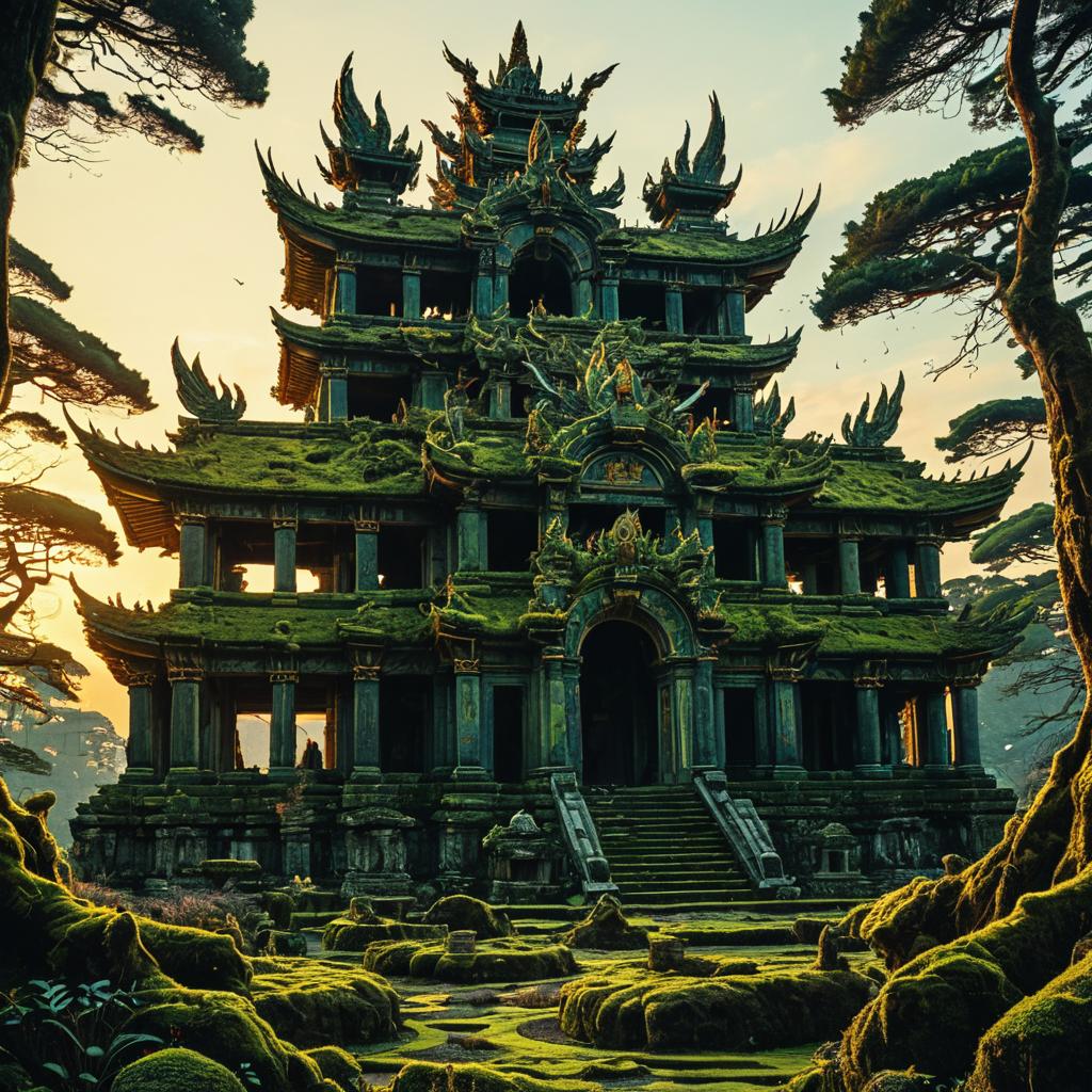 A digital artwork depicting ancient temple ruins illuminated by a golden hour sunset and moonlit night sky. The scene features grand columns and steps with intricate designs influenced by Art Nouveau and cyberpunk neon accents. A large celestial disk with constellation patterns dominates the sky and the floor, blending Pre-Raphaelite painting styles with the aesthetics of shoujo manga. The image has finely detailed inking lines and flat, vibrant colors, creating a photorealistic 4k visual effect.