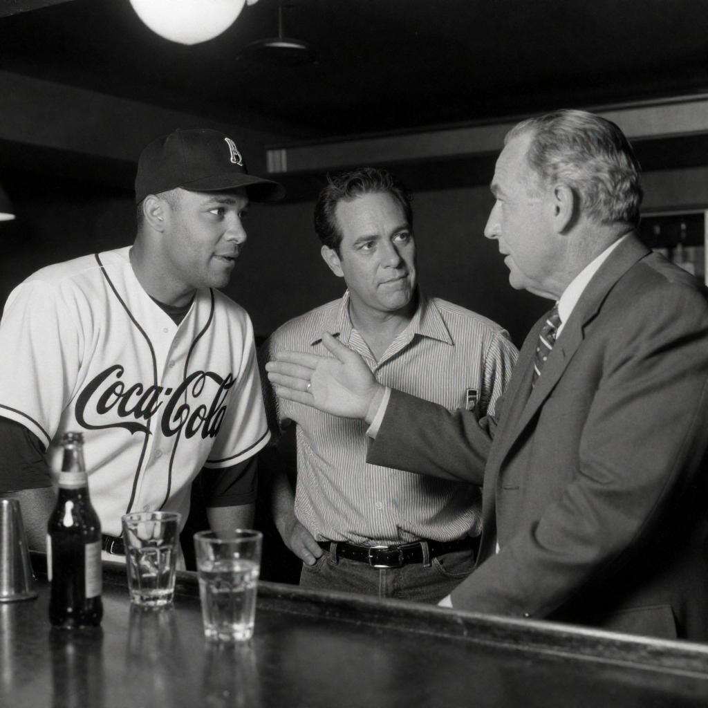 Black-and-white photograph of three men at a bar. An older man in a suit gestures towards a baseball player in a "Coca-Cola" jersey and cap, who leans forward. Another man with short hair, wearing a striped shirt, listens. Bottles and glasses are on the bar counter.