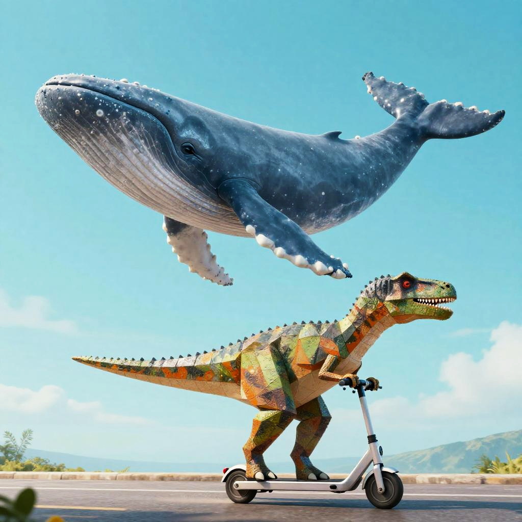 Realistic photo.Parallelogram dinosaur riding a scooter in front. A very big whale in the background trying to eat the whole picture, fantasy style with blue, green, white, orange colors, 8k, psychedelic, 16X9 - Upscaled by. realistic photo