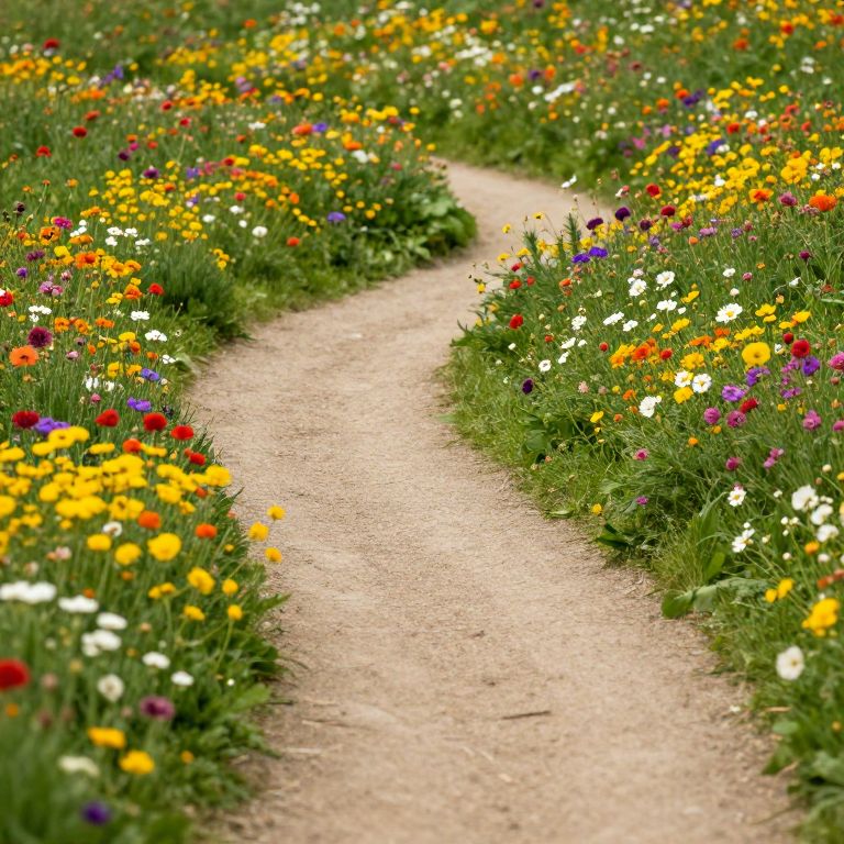 Photograph of a winding, beige gravel path flanked by vibrant, colorful wildflowers. The path is surrounded by a dense carpet of flowers in red, yellow, white, purple, and orange hues, creating a vivid, natural tapestry. The flowers are in full bloom, with varying heights and textures, set against a backdrop of lush green foliage. The image is taken from a low angle, emphasizing the winding nature of the path and the abundance of flowers. The bright colors and natural setting evoke a sense of tranquility and beauty.