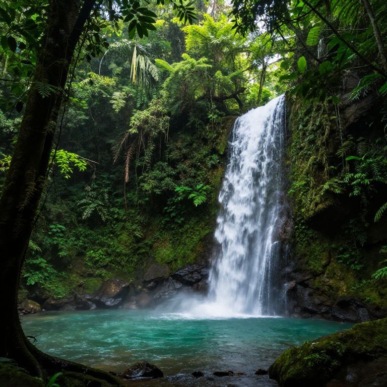 Photograph of a lush, tropical forest waterfall. A cascading waterfall descends from a rocky cliff, surrounded by dense, verdant foliage. The water pool at the base is turquoise, with mist rising from the impact. Bright sunlight filters through the green leaves, creating a dappled light effect. Dark tree trunks frame the scene, adding depth and contrast. The water appears clear and crisp, contrasting with the dark, moss-covered rocks. The overall atmosphere is serene and vibrant, capturing the natural beauty and tranquility of the forest setting.