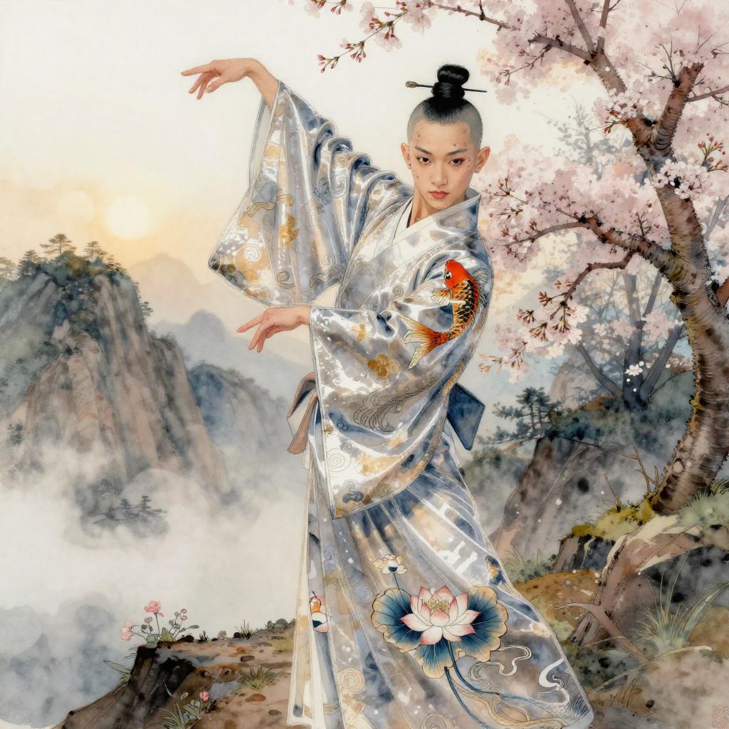 An artistic portrayal of a young East Asian non-binary dancer with shaved sides and a long topknot, expressive serene gaze, delicate facial piercings and a flowing sleeve tattoo of koi and wind motifs dressed in a flowing silver kimono with wide sleeves and embroidered lotus blossoms, standing on a misty mountain ridge surrounded by blooming cherry trees, rendered in a contemporary watercolor and digital-collage hybrid with luminous translucent washes, fine ink linework, layered paper textures, soft photographic bokeh and warm golden-hour backlighting.