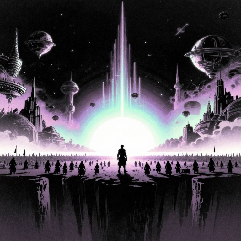 Monochrome with color, retro scan of 80s spectral neon Gradient ascii art, a 80s Sci-fi Ethereal, Dark space, 80`s sci-fi book artwork, lofi, neon-pastel colors, grainy, vintage Create a vivid description of a distant planet in the universe where enormous structures are visible from space, towering over the landscape in an awe-inspiring display where the Main content of the Image is a Silhouette of a Battlefield Sci-fi mecha infront a Low Key sunrise and the lower Part IS the DARK deep desolate cliff, the Image is Split in two parts where a DARK to bright Gradient is seen