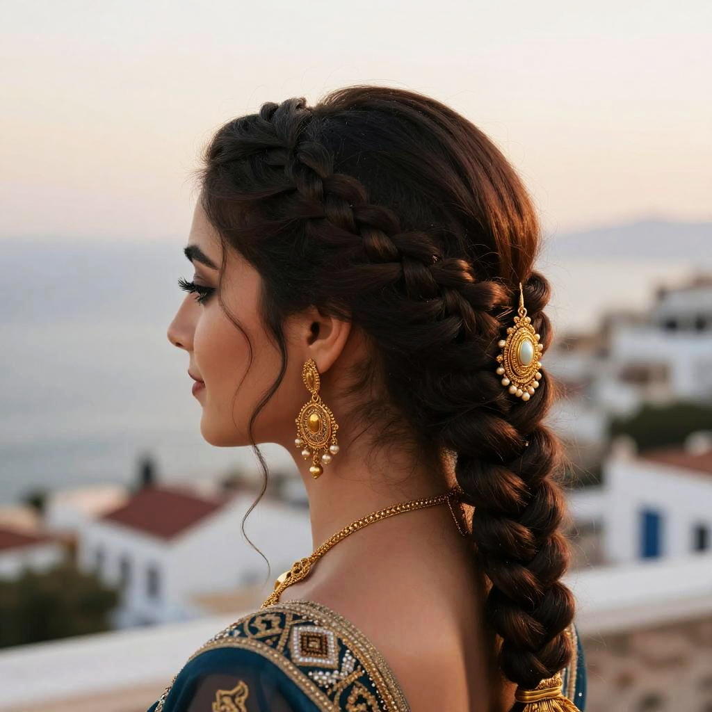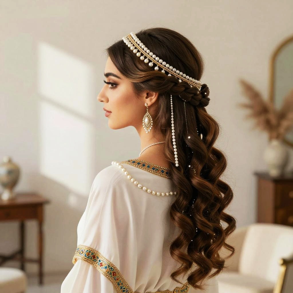Lebanese hairstyles inspired by ancient Levantine fashion, incorporating intricate twists and pearl embellishments, displayed in an elegant, sunlit studio setting.