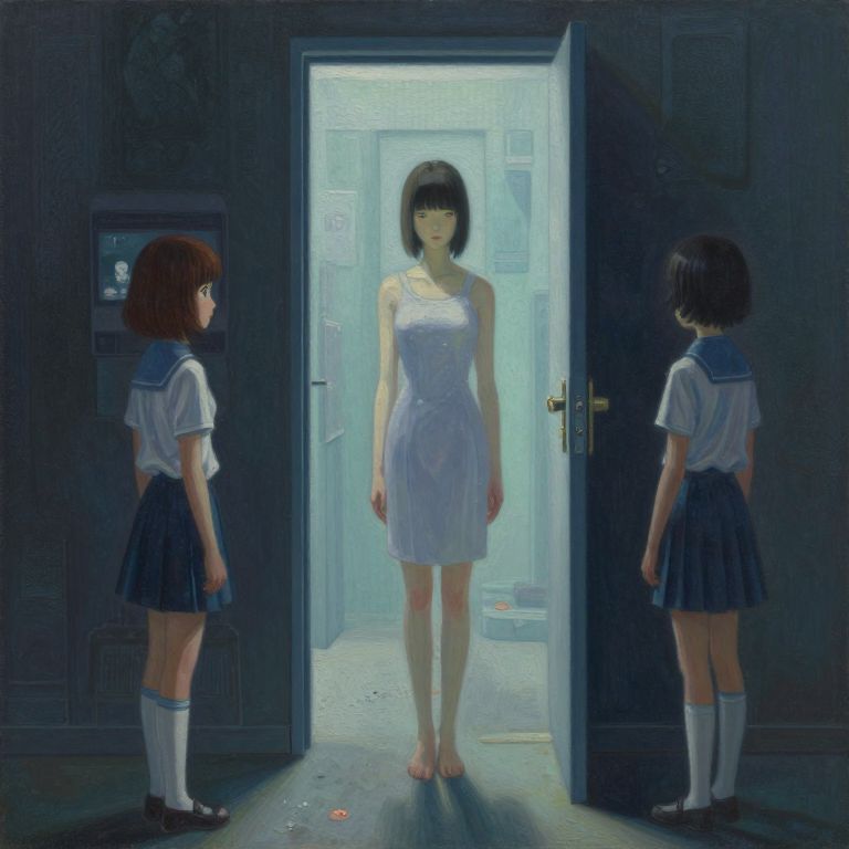 This digital anime-style illustration depicts a dimly lit room with three young girls. Two girls with short black hair, wearing white sailor uniforms with blue collars and skirts, stand on either side of an open door. They face a third girl with the same hairstyle, standing barefoot in the brightly lit doorway, wearing a simple white dress. The room's walls are dark and textured, contrasting with the bright, sterile bathroom visible behind her. The door's golden handle is to the right, and a small shelf with items is on the left. The scene evokes a mysterious, slightly eerie atmosphere.