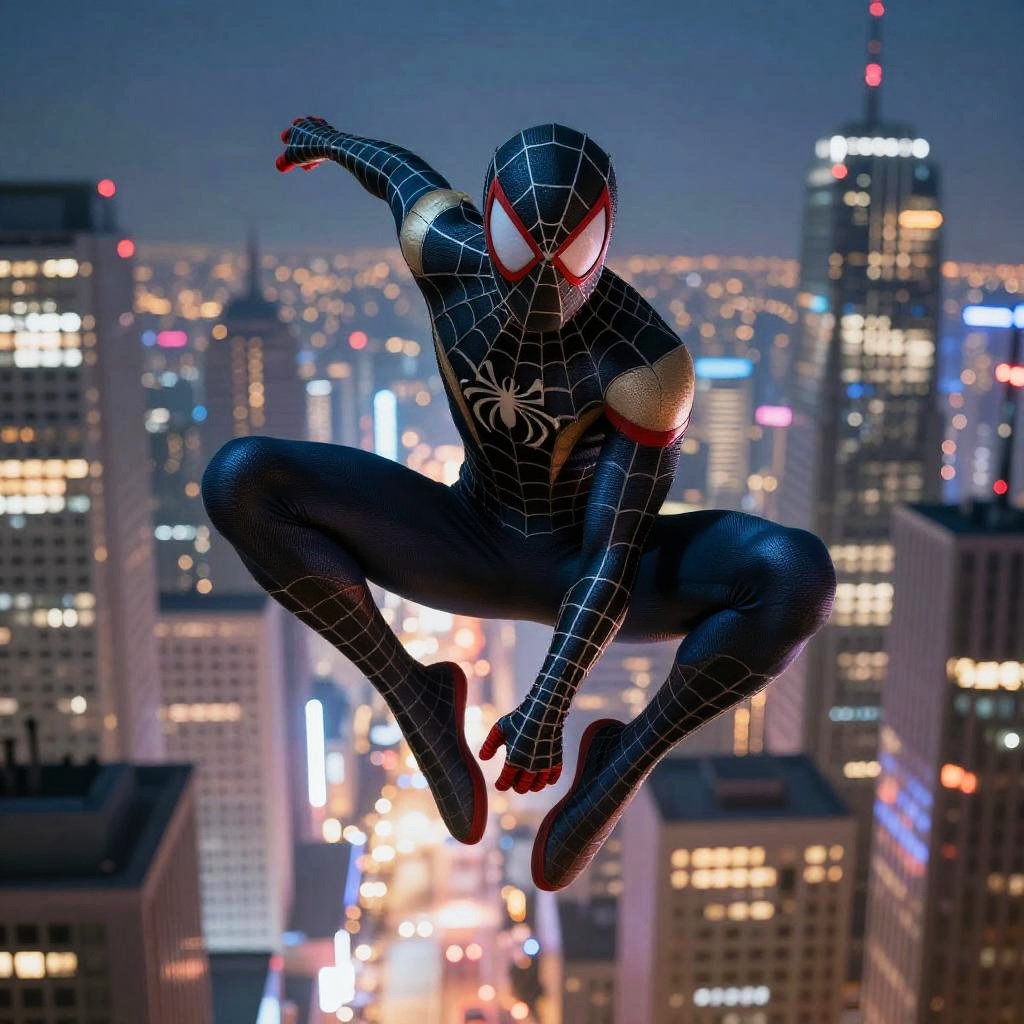 Non binary spider man web-slinging between skyscrapers, surrounded by glowing city lights, cyberpunk style, intricate suit details highlighting diversity and strength
