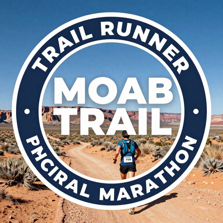 Trail Runner Magazine highlights the Moab Trail Marathon as one of its top ten \"bucket list\" races, featuring a circular emblem with bold text and a scenic desert backdrop showcasing a runner on a dirt path.